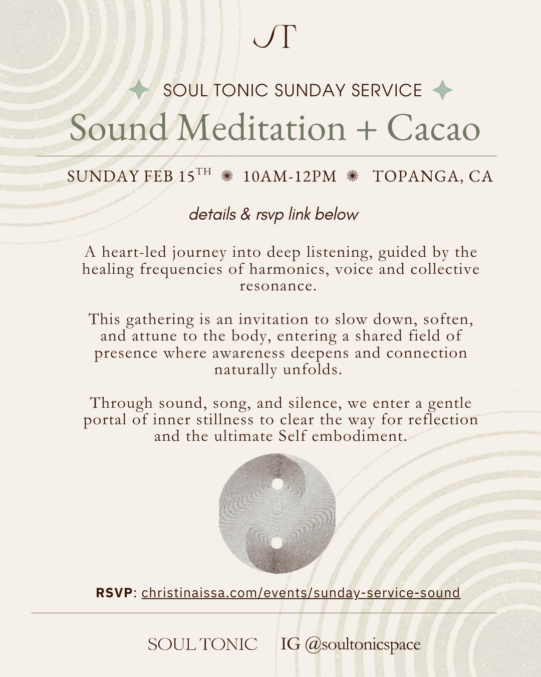 Leading with the Heart - We’ll serve optional heart-opening ceremonial cacao before flowing into a 1.5-hour sound meditation.